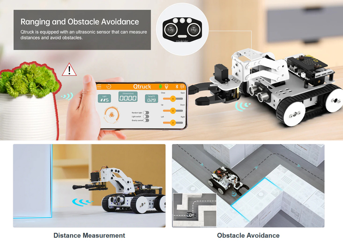 * Qtruck is equipped with an ultrasonic sensor for distance measurement and obstacle avoidance.