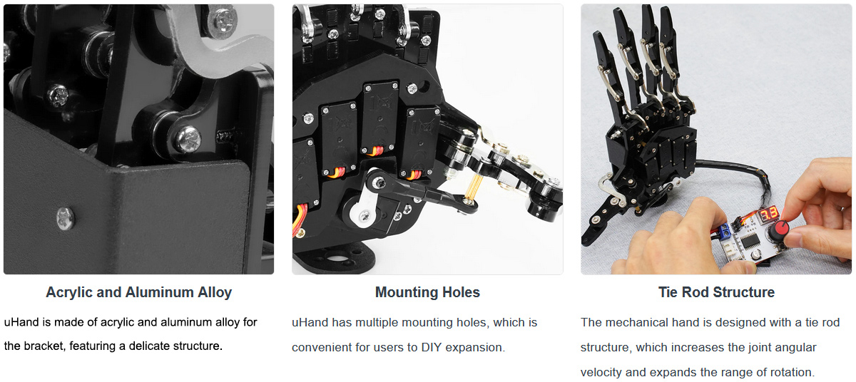 * Equipped with LFD-01 anti-blocking servos for smooth and reliable finger motion.