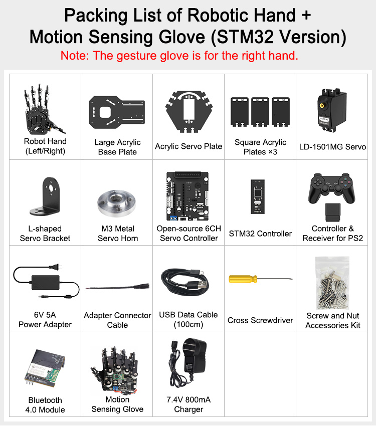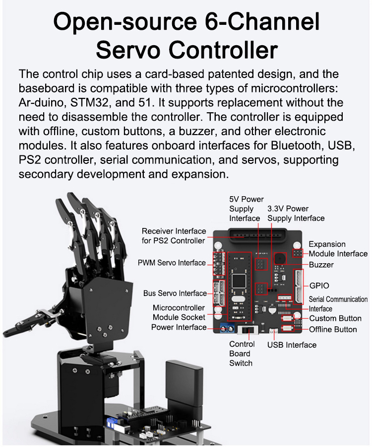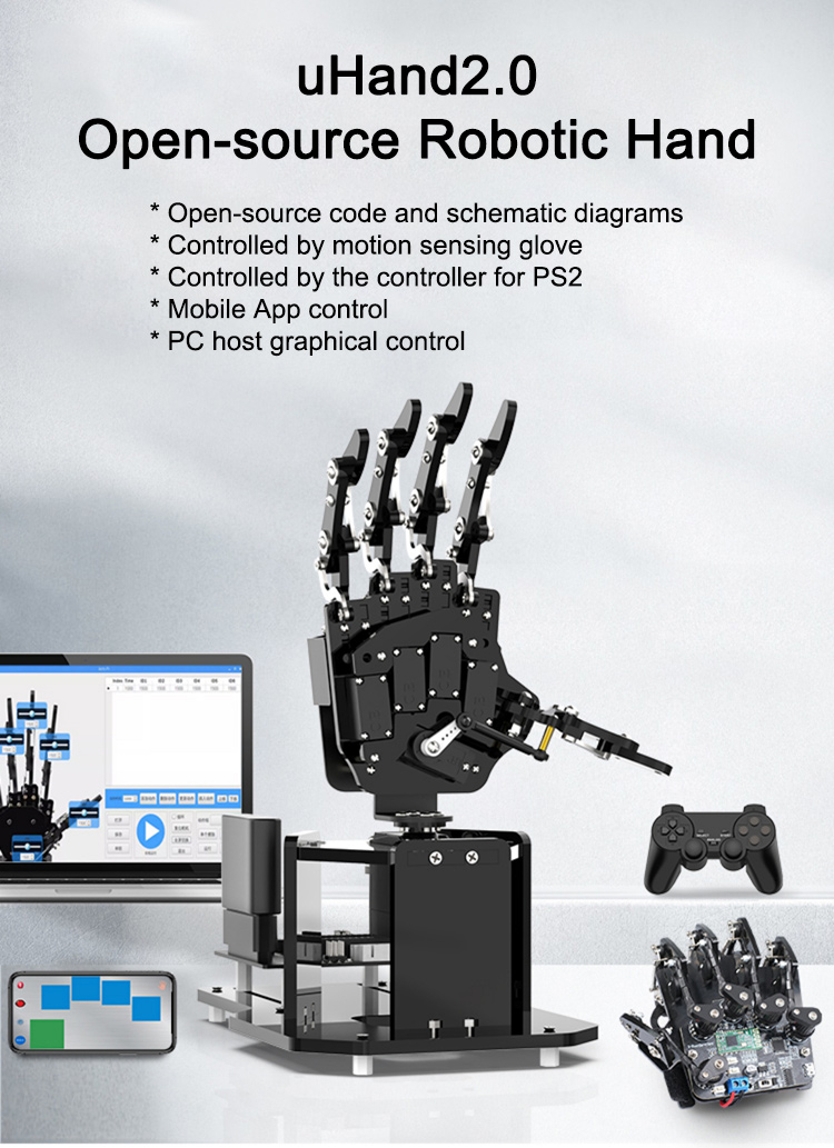 The uHand2.0 Open-source Robotic Hand uses an open-source 6-channel servo controller, which is compatible with both Ar-duino and STM32 microcontrollers. The controller features onboard interfaces for Bluetooth, USB, PS2 controller, serial communication, and servos, enabling control via gesture gloves, mobile apps, controllers for PS2, and PC host graphical interfaces. It supports secondary development and expansion. Additionally, the hand uses 5 anti-blocking servos, each equipped with an anti-blocking chip to prevent damage from stalling. We have also provided the open-source code and schematic diagrams, along with detailed materials and tutorials, to facilitate user development and expansion!