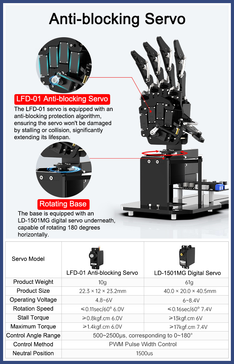* The LFD-01 servo is equipped with an anti-blocking protection algorithm, ensuring the servo won't be damaged by stalling or collision, significantly extending its lifespan.
