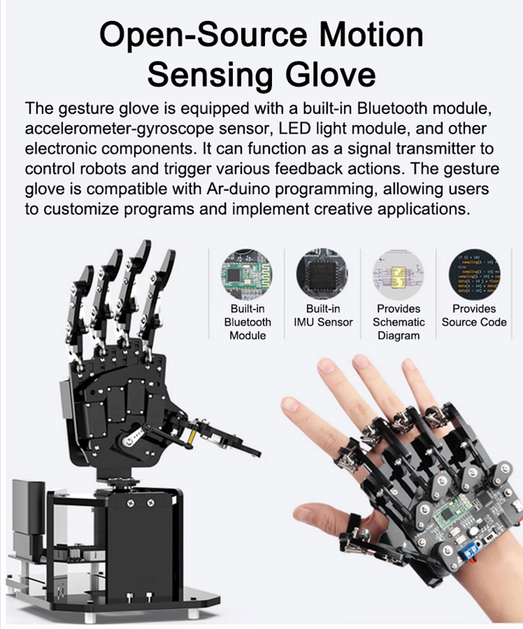The gesture glove is equipped with a built-in Bluetooth module, accelerometer-gyroscope sensor, LED light module, and other electronic components. It can function as a signal transmitter to control robots and trigger various feedback actions. The gesture glove is compatible with Ar-duino programming, allowing users to customize programs and implement creative applications.