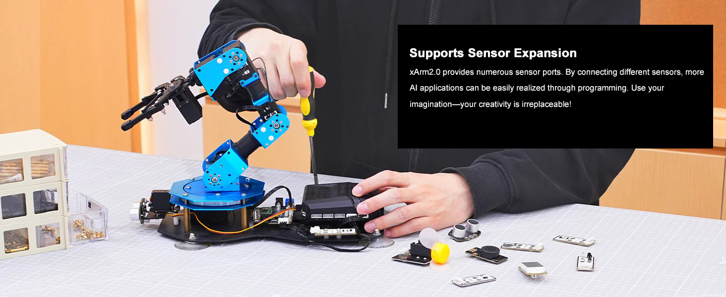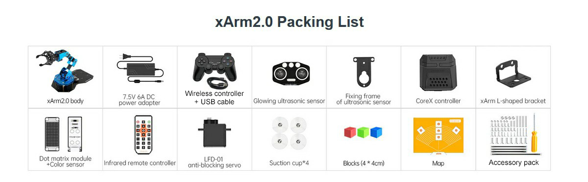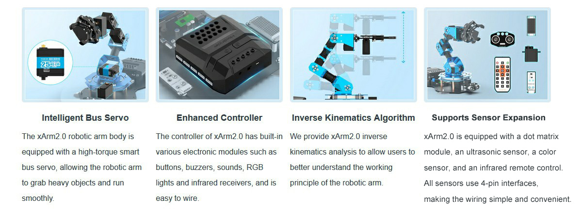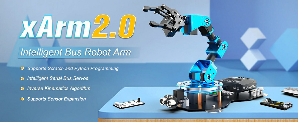 xArm2.0 stands out as a programmable desktop robot arm featuring intelligent serial bus servos that provide position and voltage feedback for precise and reliable control. It supports collaboration with multiple units, making it an excellent companion for learning programming and electronics. The arm is compatible with both Scratch and Python programming, suitable for beginners and advanced learners alike. Equipped with over 10 electronic modules, xArm2.0 allows users to explore various functionalities, including omnidirectional detection, color sorting, and a wide range of creative games. Additionally, it is fully compatible with all Hiwonder sensors, offering significant expansion potential for customized projects.