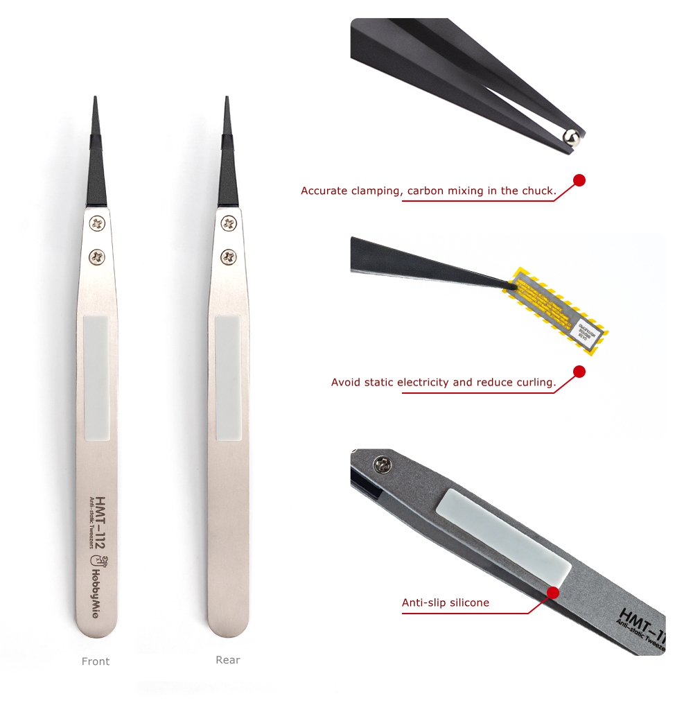 - HMT-112 anti-static tweezers: made of mixed carbon material, with high-precision clamps that securely grip parts. The anti-static clamps are not easily curled when operated with water stickers.
