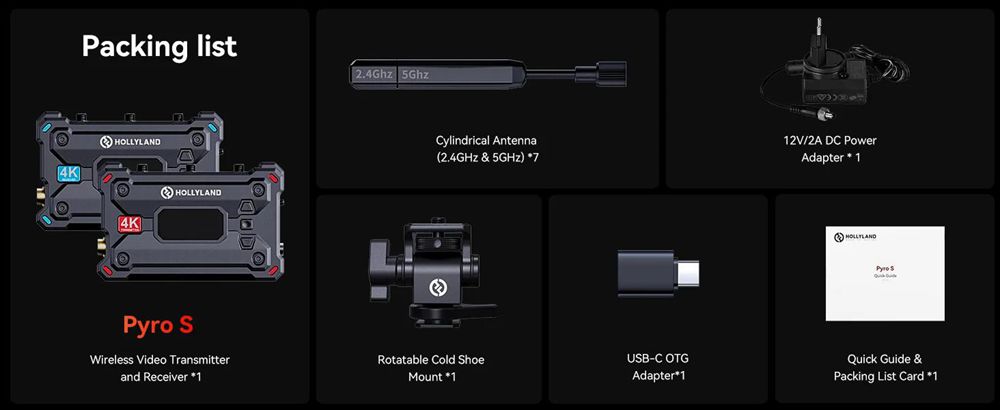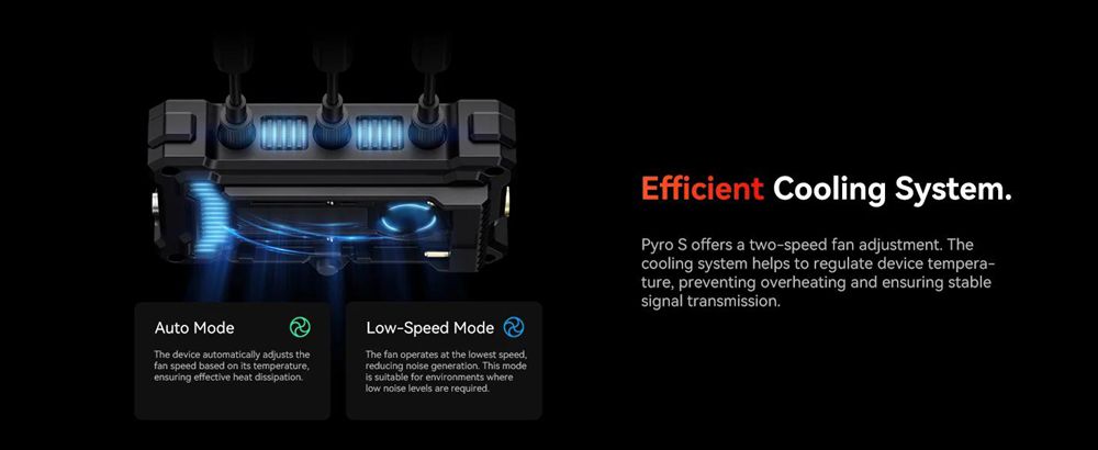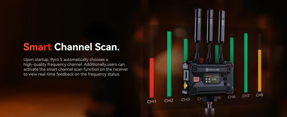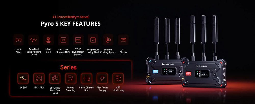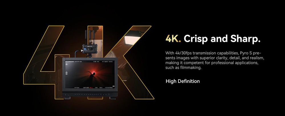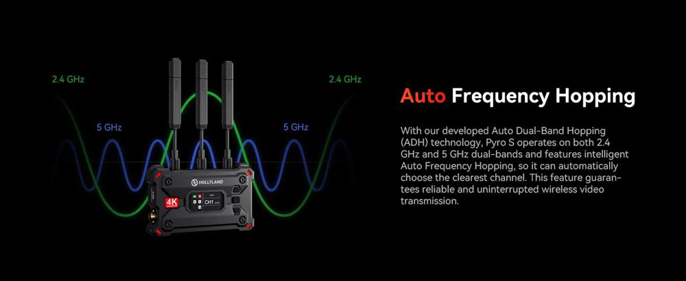- Pyro S elevates your production with stunning 4K/30fps resolution , ensuring crisp, clear visuals for high-impact content. Complemented by Auto Dual-Band Hopping (ADH) technology, it automatically switches between 2.4GHz and 5GHz frequencies to maintain the best possible signal free from interference.