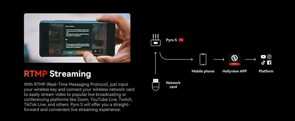 - Pyro S simplifies live streaming by harnessing UVC (USB Video Class) for plug-and-play compatibility with computers—no capture cards or complex software needed. Plus, it's equipped with RTMP streaming capability; simply connect to your network via a wireless card, and you're ready to broadcast directly to platforms for YouTube Live, TikTok Live, and more.