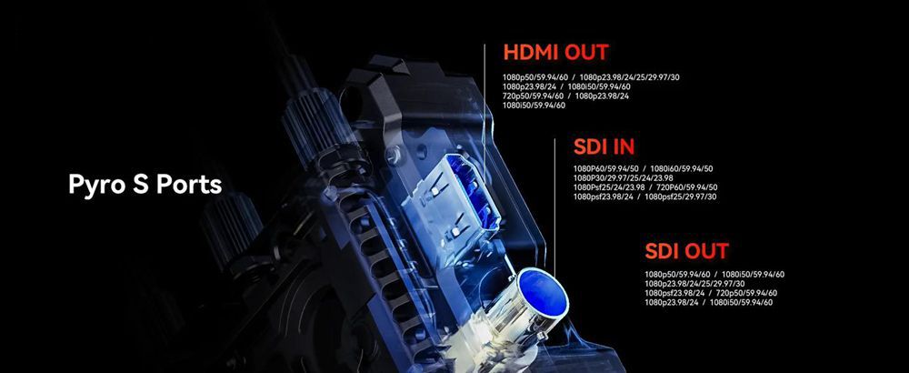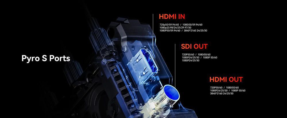 - Pyro S features robust HDMI-compatible and SDI ports, supporting a diverse range of video input/output formats for maximum compatibility with industry-standard equipment. With resolutions up to 4K30fps via HDMI-compatible and versatile frame rate handling through SDI (23.98/29.97/59.94 FPS), this device ensures your productions are equipped for top-tier visual fidelity and flexibility.