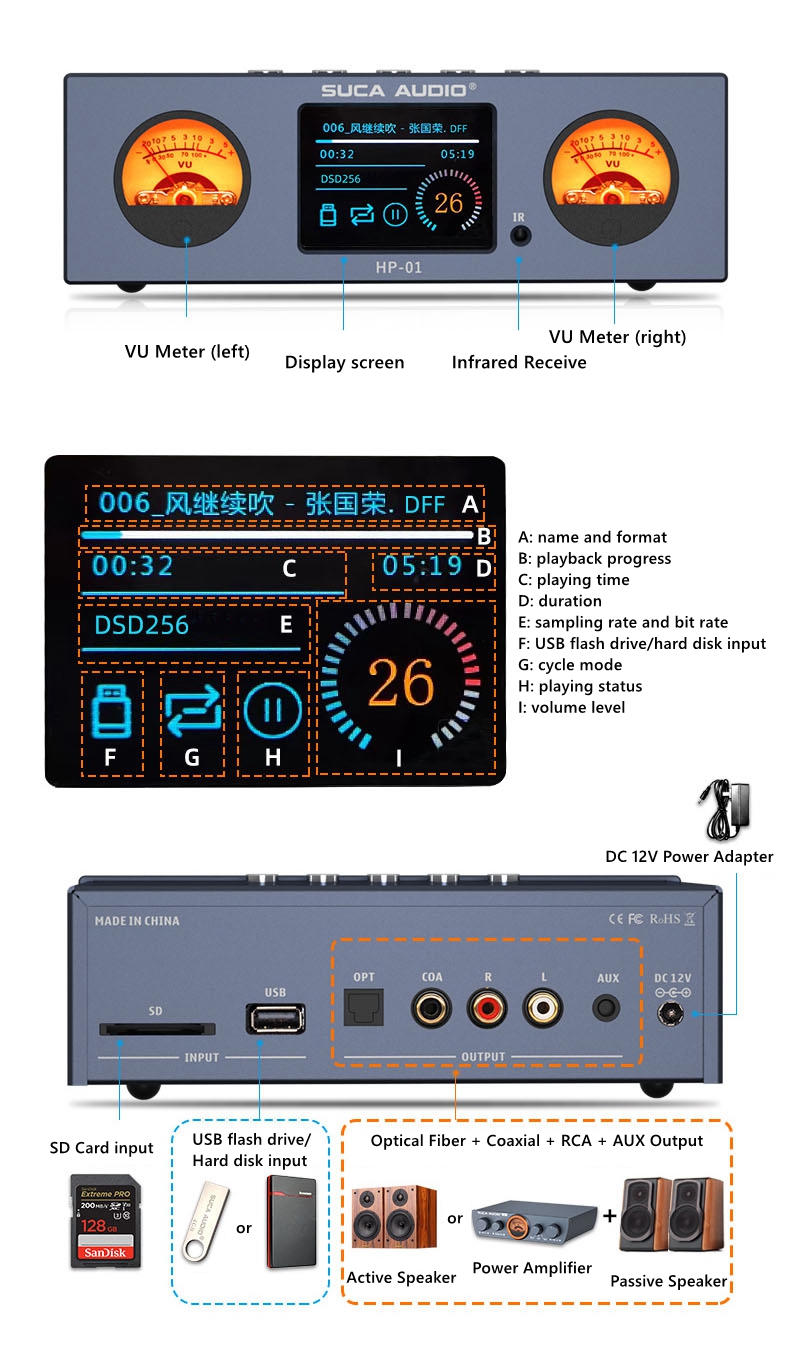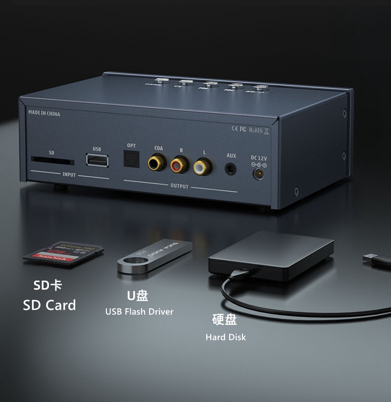 - It is a DSD player supporting hard disk/USB flash drive/SD Card.