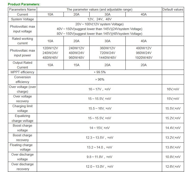 12v/24v/48v auto work.The controller choose MPPT charging,the efficiency