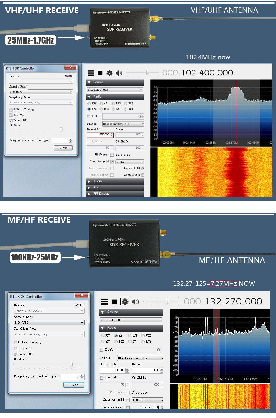 -100KHz-1.7GHz full-band RTL-SDR receiver, can be connected to computers, Android phones and other devices, use SDR software to receive 100KHz-1.7GHz electromagnetic waves, support AM, FM (NFM, WFM), CW, DSB, LSB, USB demodulation. It can be used to receive medium wave, short wave, FM radio, short wave single sideband communication, intercom call, aviation band, etc. (added the function of detecting mute, CTCSS, DCS, scanner, digital signal, automatic scanning, etc.).