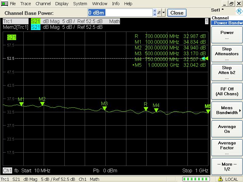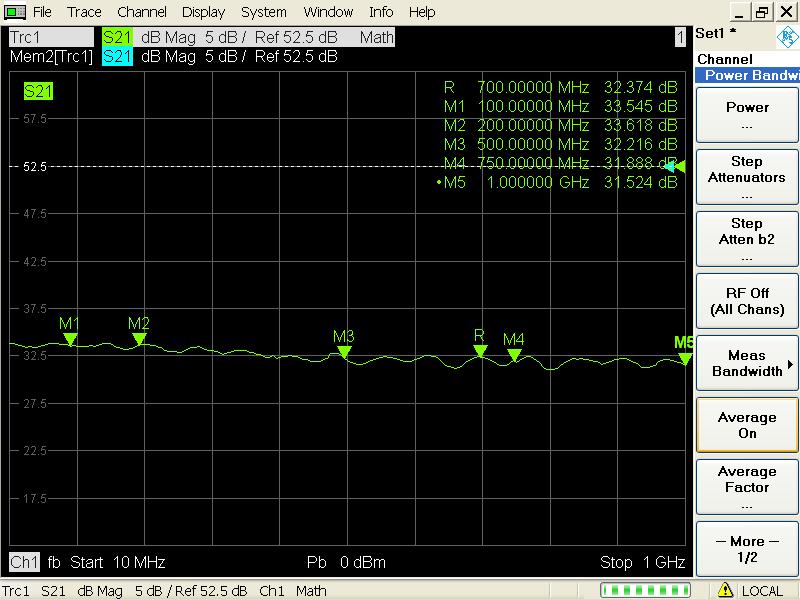 The figure below is 15V, input 5 dBm saturated power output, the output power of the whole frequency band is greater than 32 dBm, and greater than 33 dBm (2W) below 700MHz.