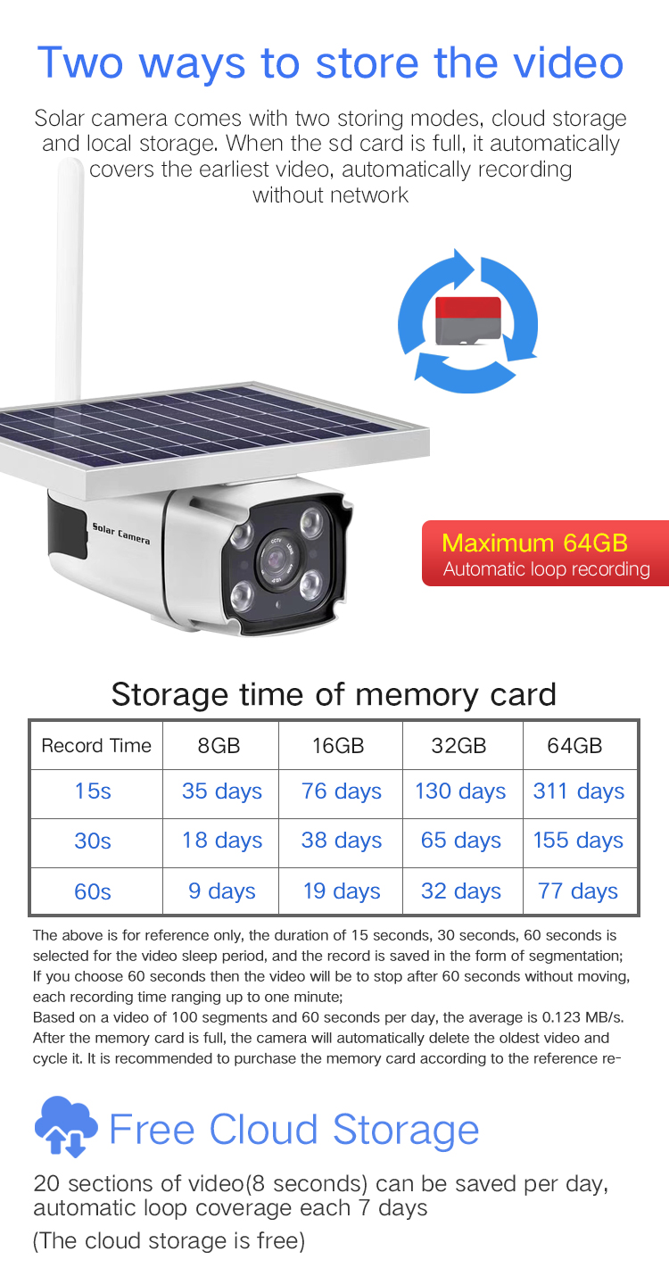 - Storage capacity: A 32G card can store for about 64 days (it can store about 9000 videos, 30 seconds for each shooting, and 100 times a day for calculation). After the storage is full, it will be overwritten from the earliest day of shooting