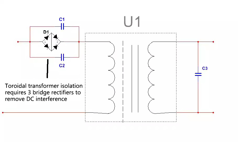 After superimposing the mains electricity, because the core of the toroidal transformer has no magnetic gap, the core will enter the state of magnetic saturation, so that the efficiency of the toroidal transformer decreases, and it even cannot work. And the toroidal transformer will also produce abnormal noise when a fuse is burned. In order to keep the circuit working properly, as shown in the figure, the primary causes the DC removal circuit: