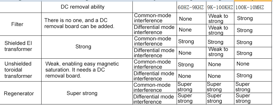 As pictured above, the filter does not have the ability to remove DC. It has no suppression ability against common-mode interference from 60Hz-9KHz. However, shielded EI transformer is able to remove DC and 60Hz-9KHz common mode interference!