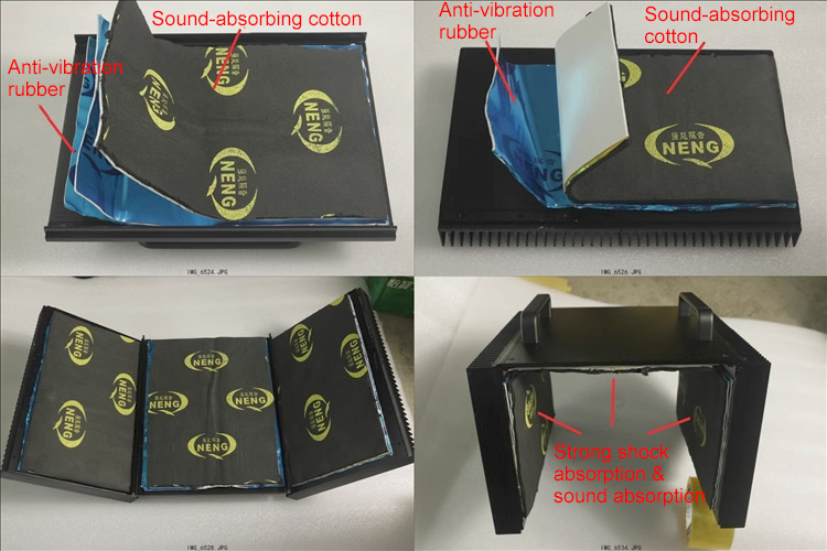 - The shell is fully sealed and has no heat dissipation holes (to prevent humming from coming out). Shock absorber adhesives applied to the inside of the housing to minimize humming.