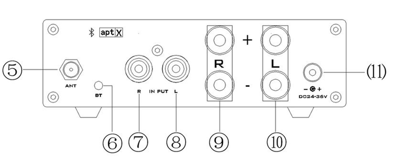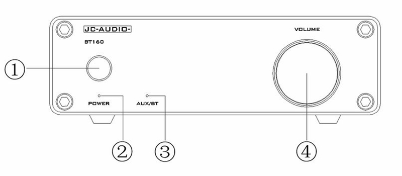 ① Multi-function Button. Long press for power on and off (long press for 2s to power on, long press for 2s to power off). Short press to switch audio source input (short press for about 0.2s, cyclically switch RCA/Bluetooth.)