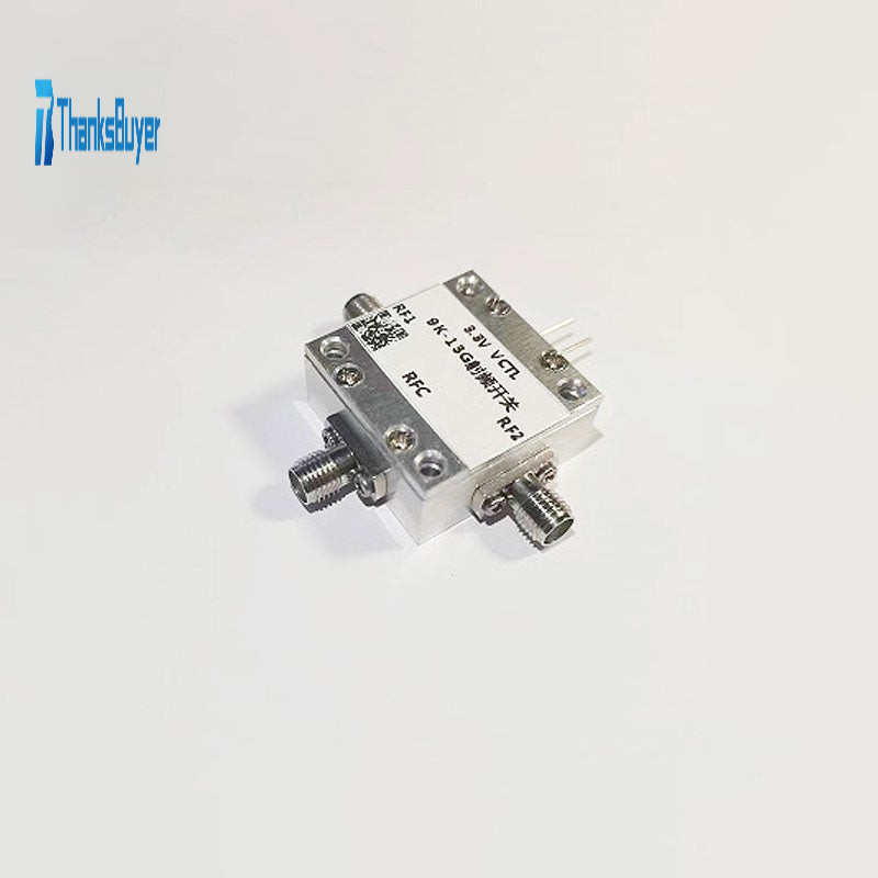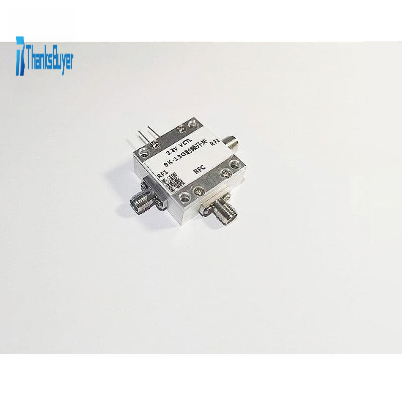 The microwave switch, also known as radio frequency switch, realizes the function of controlling the conversion of the microwave signal channel. This module adopts SPDT mode, broadband operation, frequency coverage 9K-13GHz, covering V, U, L, S, C, X bands. It can be used in typical frequency points: 433M, 486M, 915M, 1575M, 2.4G, 3.4GHz, 5.8G, 10G, 12G; especially in 5.8GHz, it has excellent parameter effects. This module realizes the switching of two signals. Because of its low insertion loss, wide frequency band, high isolation, and small size, it is widely used in communication system equipment. With CNC shell, the module has good electromagnetic shielding performance.
