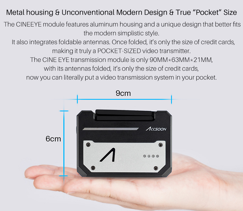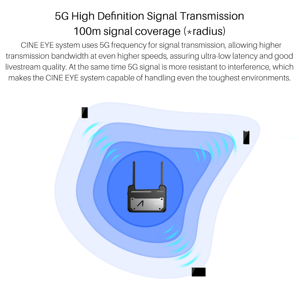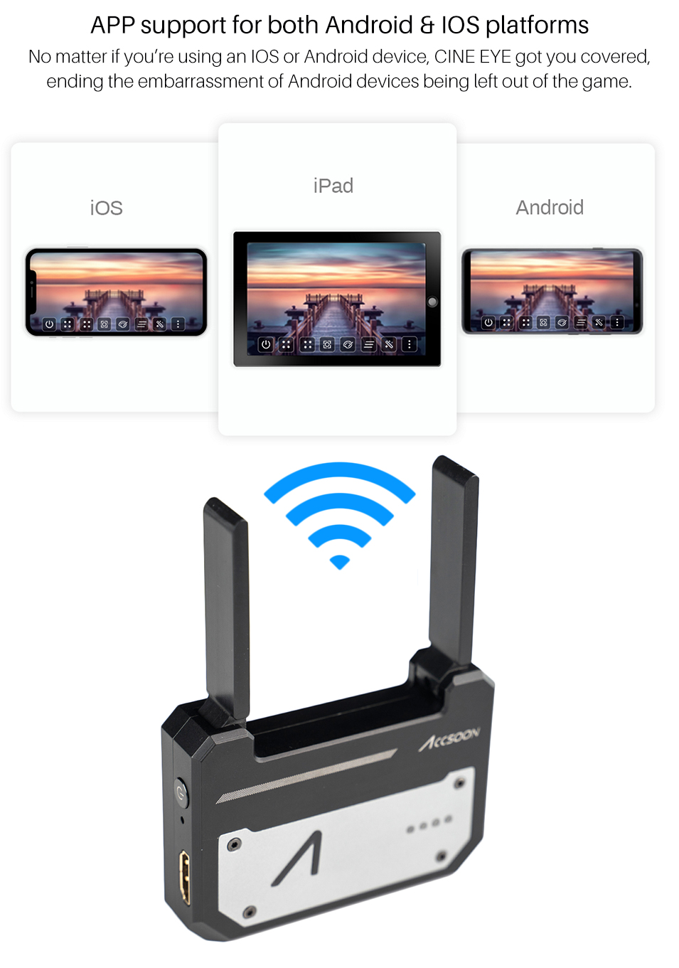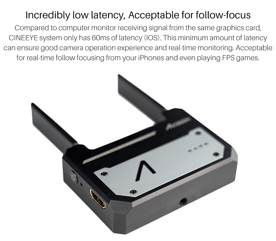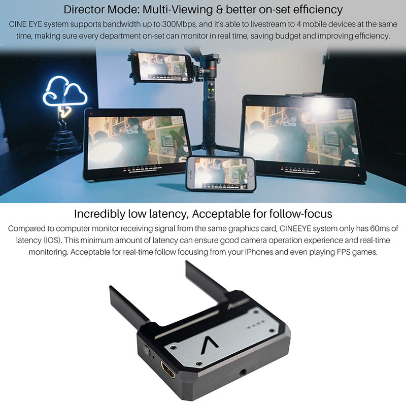CineEye is a revolutionary product. Unlike traditional image transmission, CineEye uses mobile devices as receivers and monitors. Users can achieve image transmission and screen monitoring without using separate receivers and monitors. CinEeye features a lightweight, wireless and portable design which can save wiring and debugging time, while reducing the weight of the user load equipment, allowing users to create more freely.