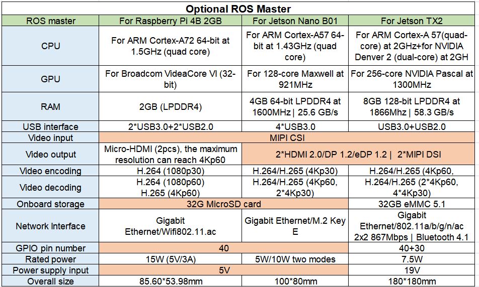 3. The performance for Jetson TX2 is very powerful, especially in deep learning, the overall performance is qualitatively improved compared to the other two models. You can also customize i5, i7 and other industrial computers as ROS master control, and you can contact customer service for customization.