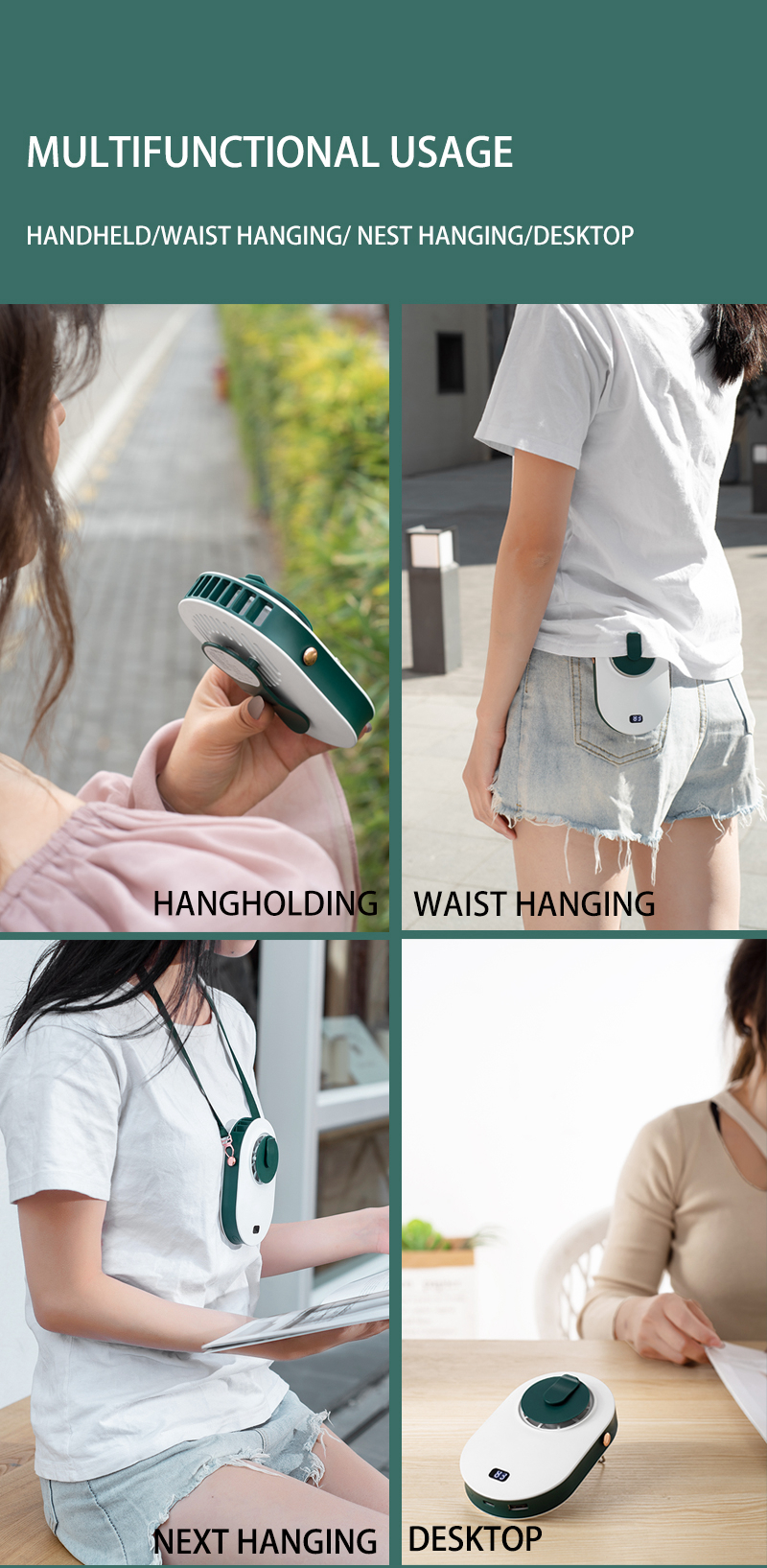 - Neck waist fan: Can be hung on the waist, neck, hand held or placed on the table