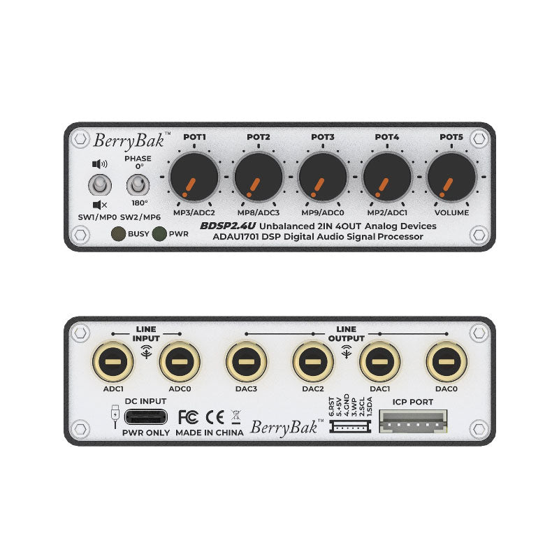 - BDSP2.4U is a digital audio processor (DSP) equipped with ADAU1701 chip, with a working voltage range of 4.5V to 5.5V, built-in 24 bit ADC/DAC resolution, and a dynamic range of up to 101.3dB. This device has flexible audio processing capabilities, including 2-channel input and 4-channel output, and can be customized through 5 potentiometers and 2 switches. In addition, it also supports for SigmaStudio programming, suitable for advanced audio engineering.