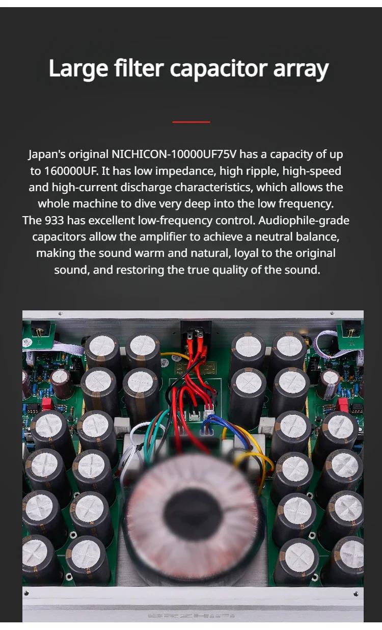 - 933 has excellent low-frequency control and is proud of its main filtering effect. The high temperature capacitor allows the amplifier to achieve neutral balance, resulting in warm and natural sound that is faithful to the original sound and restores the true quality of the sound.