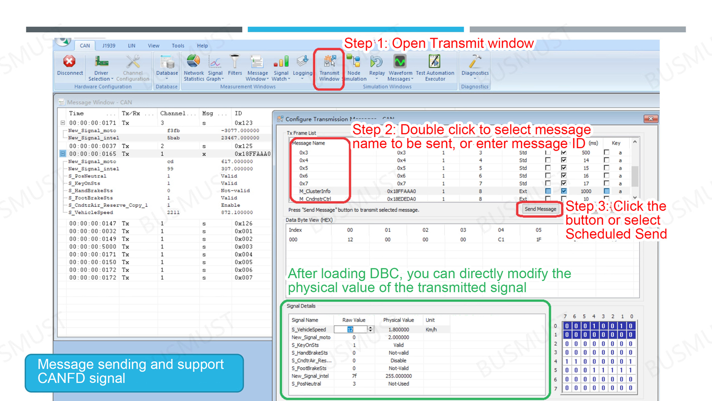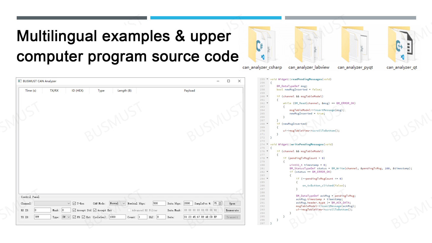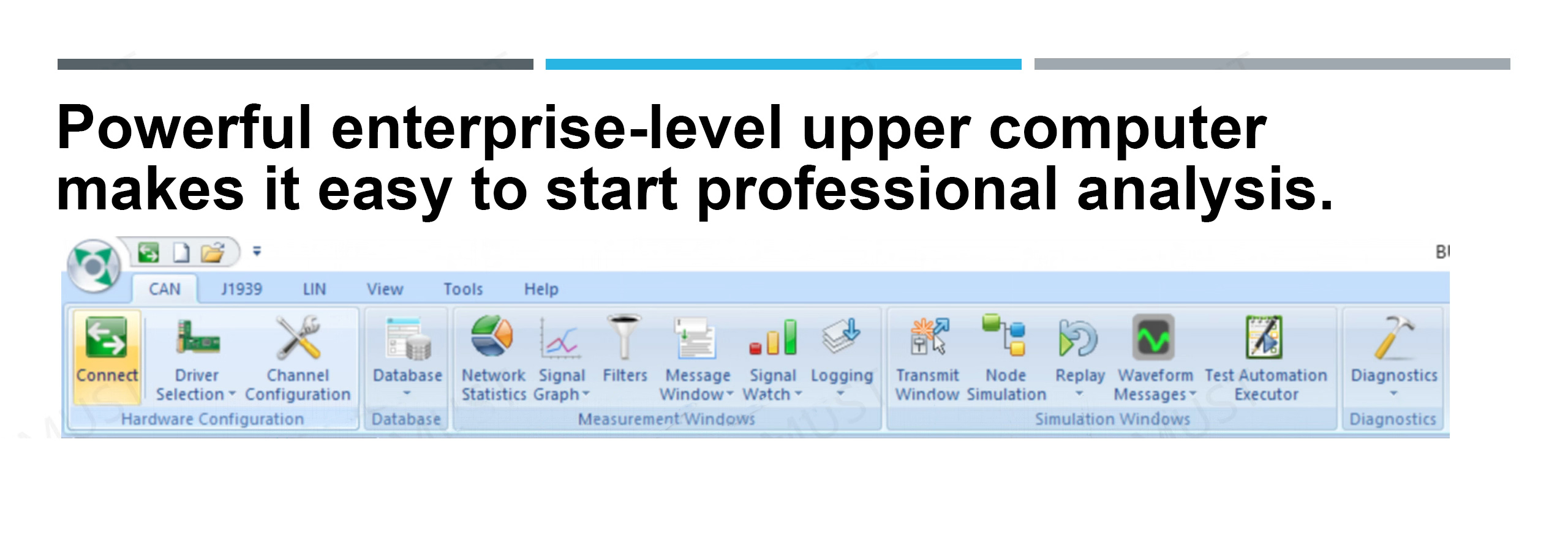 - Industry-leading host computer function: support enterprise-level functions such as DBC loading, recording playback, signal analysis, curve drawing, node simulation, UDS and automatic testing