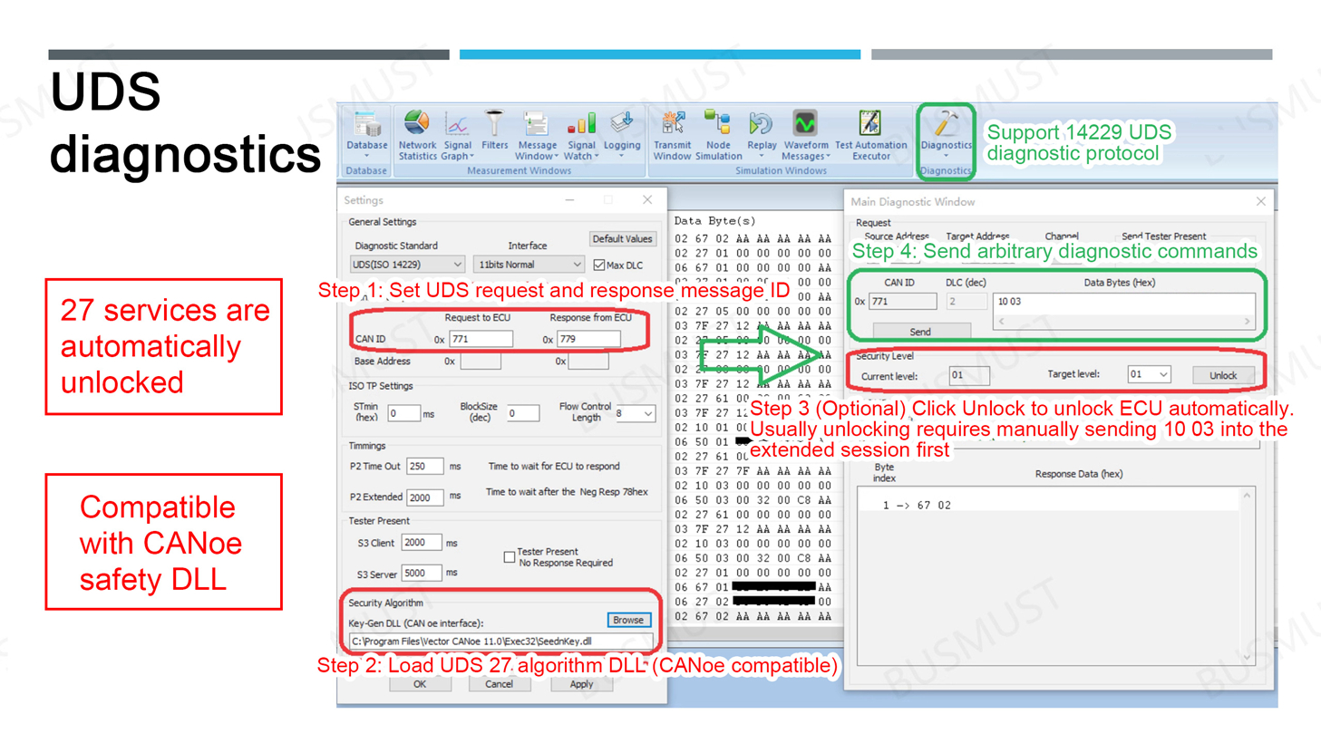 - Support loading UDS 27 security algorithm DLL automatic unlocking ECU (compatible with CANoe security DLL interface)