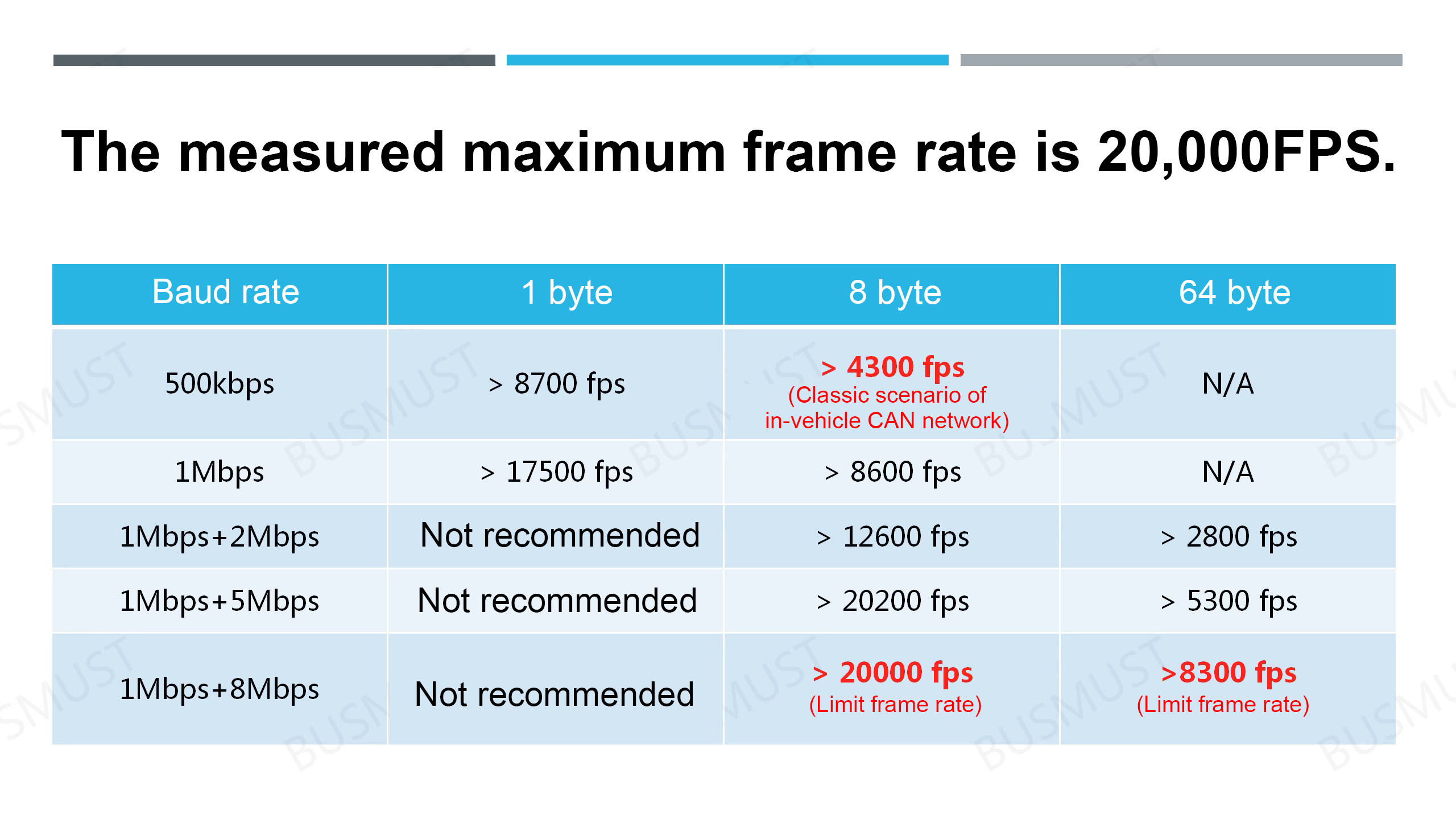 - Innovative three-level frame-buffer design, 24-hour bus full load test without frame loss in classic scenarios such as 500kbps