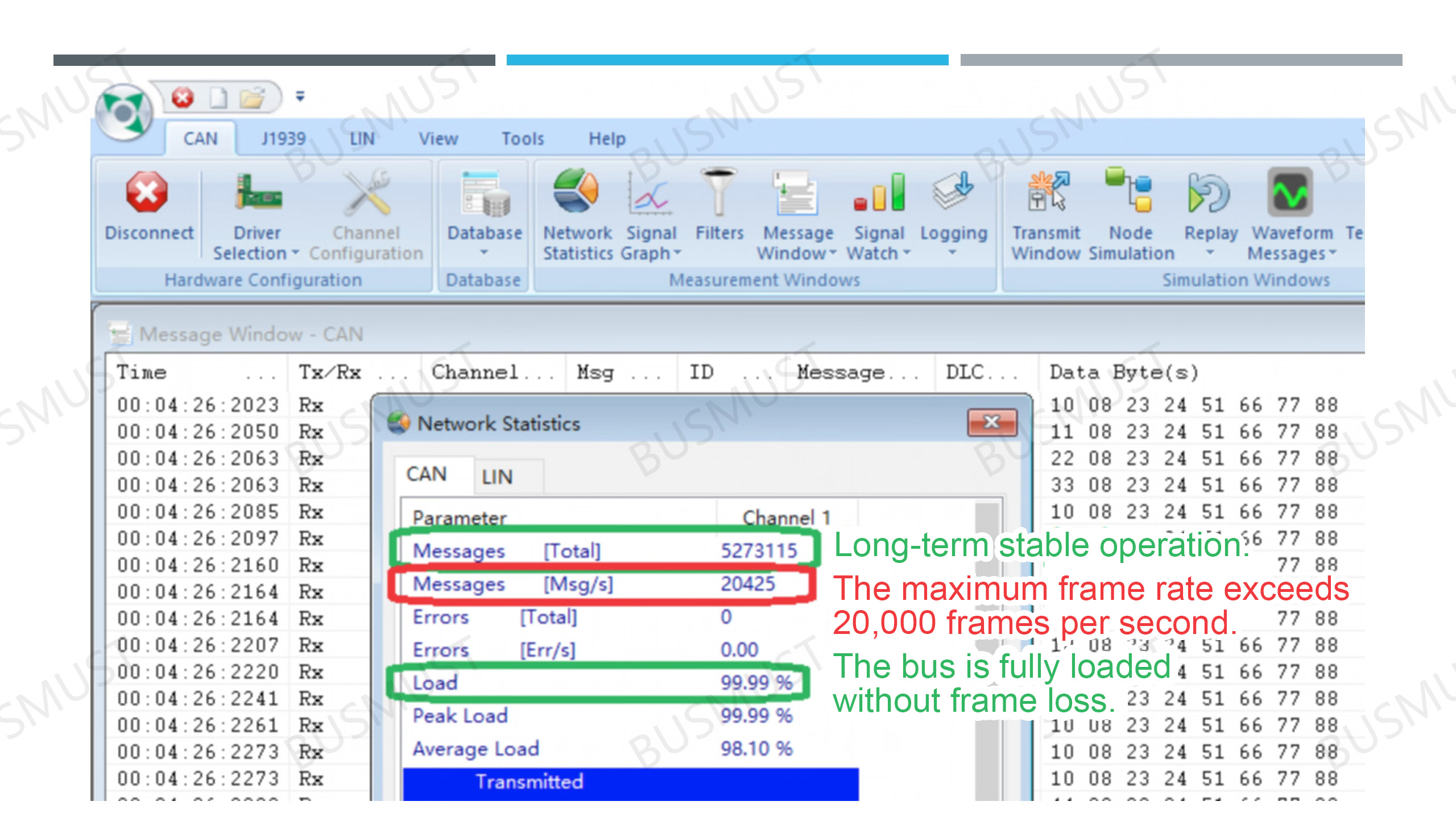 - The frame rate information for the above test comes from the automatic receiving statistics function in Network statistics in the BusMaster enterprise upper computer provided by this product.