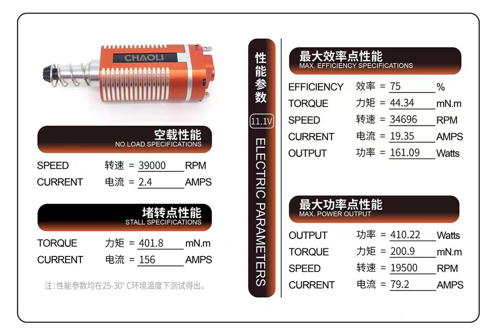 - When the load current is 19.4A, the motor can achieve the maximum output efficiency, with the highest energy conversion efficiency of up to 75%; Lower power consumption with the same power, more energy-efficient, and less heat generation. The peak power of 410W refers to the electrical power consumed by the motor when outputting the maximum torque (2050gf.cm).