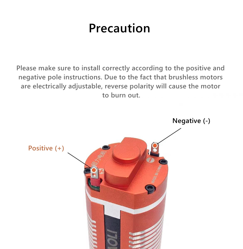 - Please make sure to install correctly according to the positive and negative pole instructions. Due to the fact that brushless motors are electrically adjustable, reverse polarity will cause the motor to burn out.