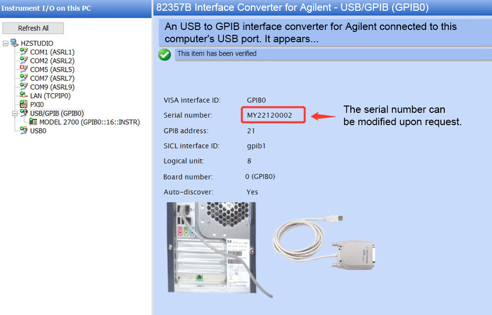 The GPIB to USB interface is compatible with 82357B interface for Agilent and Keysight. The GPIB USB adapter can be used to replace 82357B. It can be displayed in IO Suite software for Agilent and Keysight.