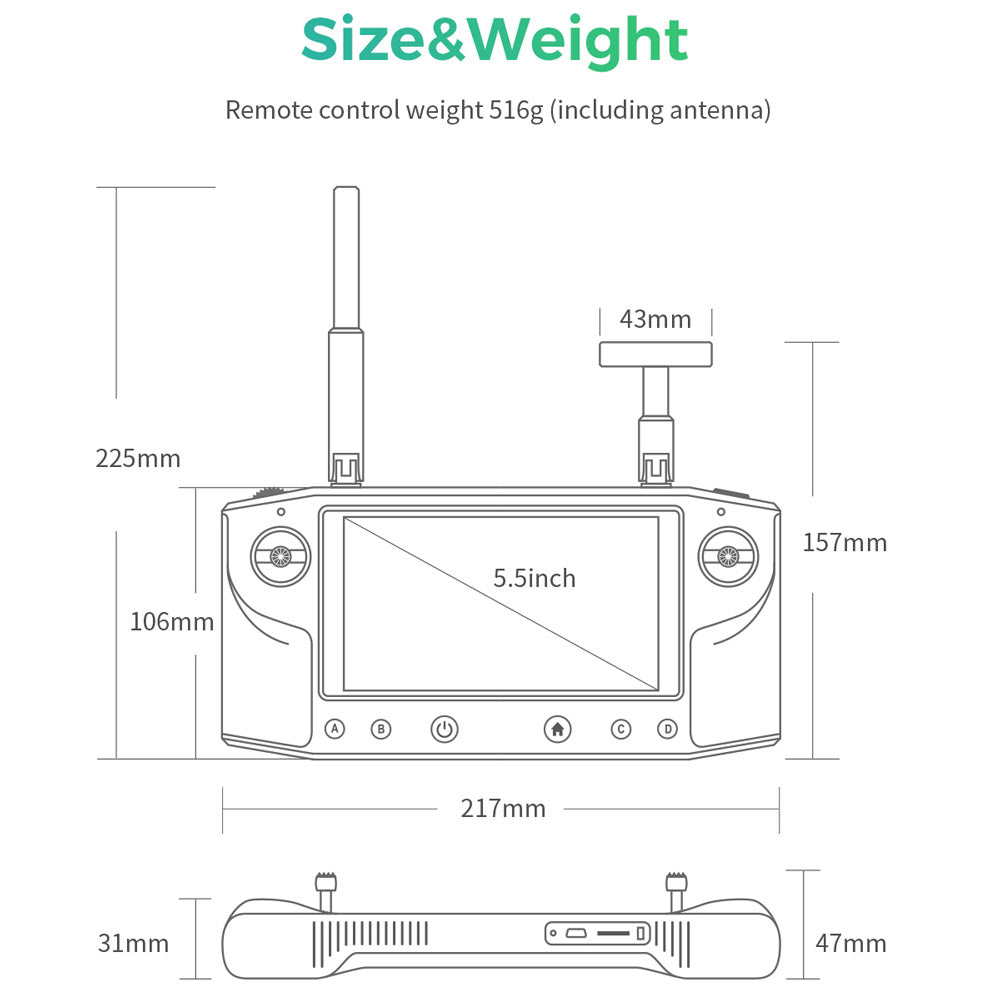 - Power Consumption: The average does not exceed 4W (* Only when image transmission is working, with medium-brightness screen, WiFi off and GPS off.)