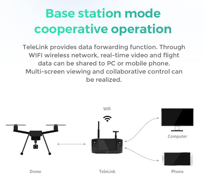 - Base Station Mode Enabling Cooperative Operation: It provides data forwarding function. Through WiFi wireless network, real-time video and flight data can be shared to a PC or mobile phone, which can realize multi-screen viewing and collaborative control.