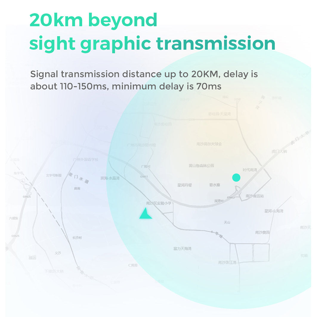 - 20KM Image Transmission: Signal transmission distance is up to 20KM, the delay is about 110-150ms, and the minimum delay is 70ms.