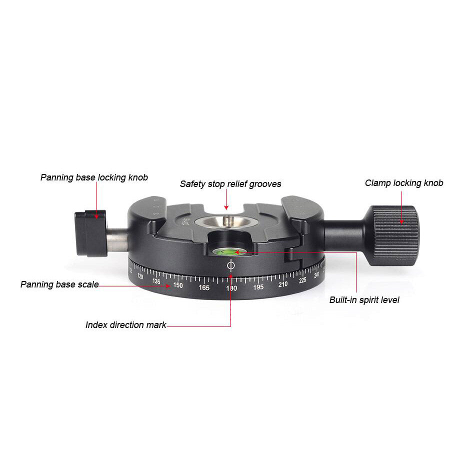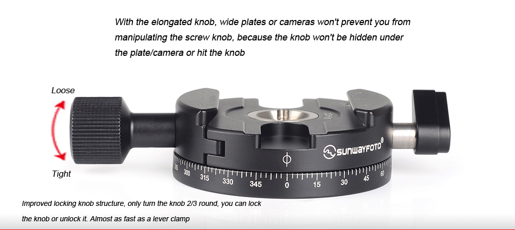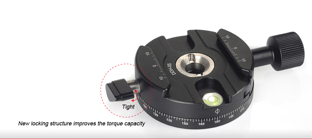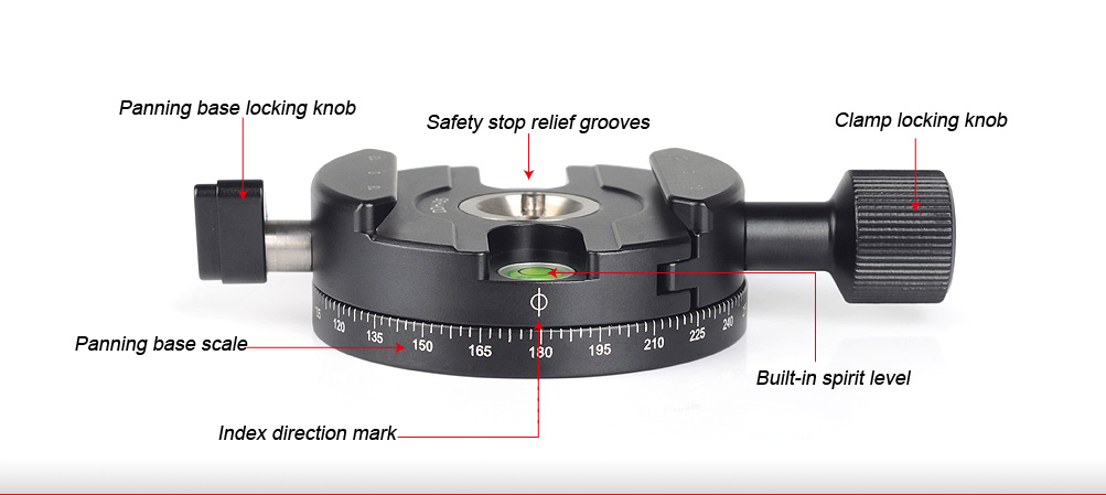 The scale with laser-engraved centering index marks can precisely master any angle variation during each shoot in horizontal rotation, the aligned scale of quick-release plate can accurately control the nodal point during the panoramic photography in different focal lengths. So the panoramic photography could be more accurate and high efficient.