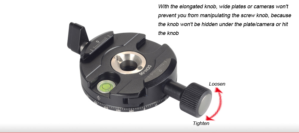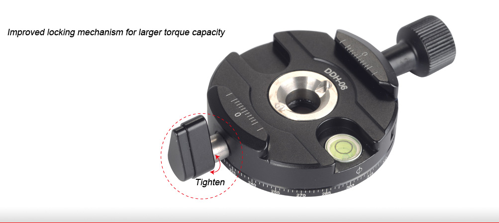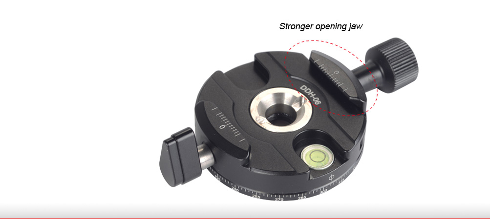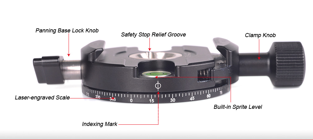 The scale with laser-engraved centering index marks can precisely master any angle variation during each shoot in horizontal rotation, the aligned scale of quick-release plate can accurately control the nodal point during the panoramic photography in different focal lengths. So the panoramic photography could be more accurate and high efficient.