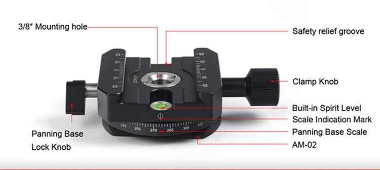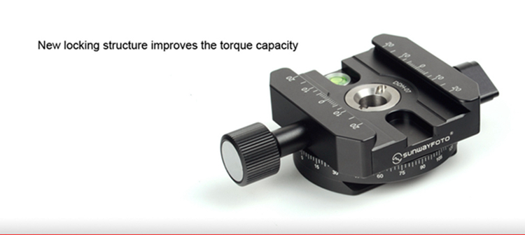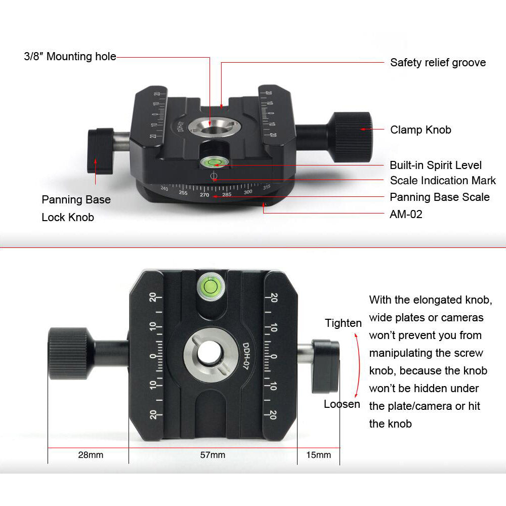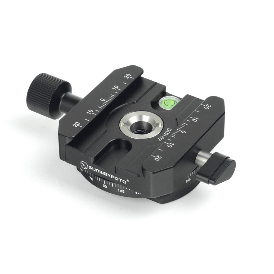 DDH-07 panoramic panning clamp is CNC machined from T6061 grade aerospace aluminum alloy with military Type-III hard-anodized. The top square base maximizes the contact area between clamp and plate, which provides photographers with a more stable shooting equipment in severe environment, and it’s suitable for Canon 1DX, Nikon D4S, D3X, etc. professional cameras. The base AM-02 plate is for Arca-Swiss standard and can be mounted on any products of this standard.