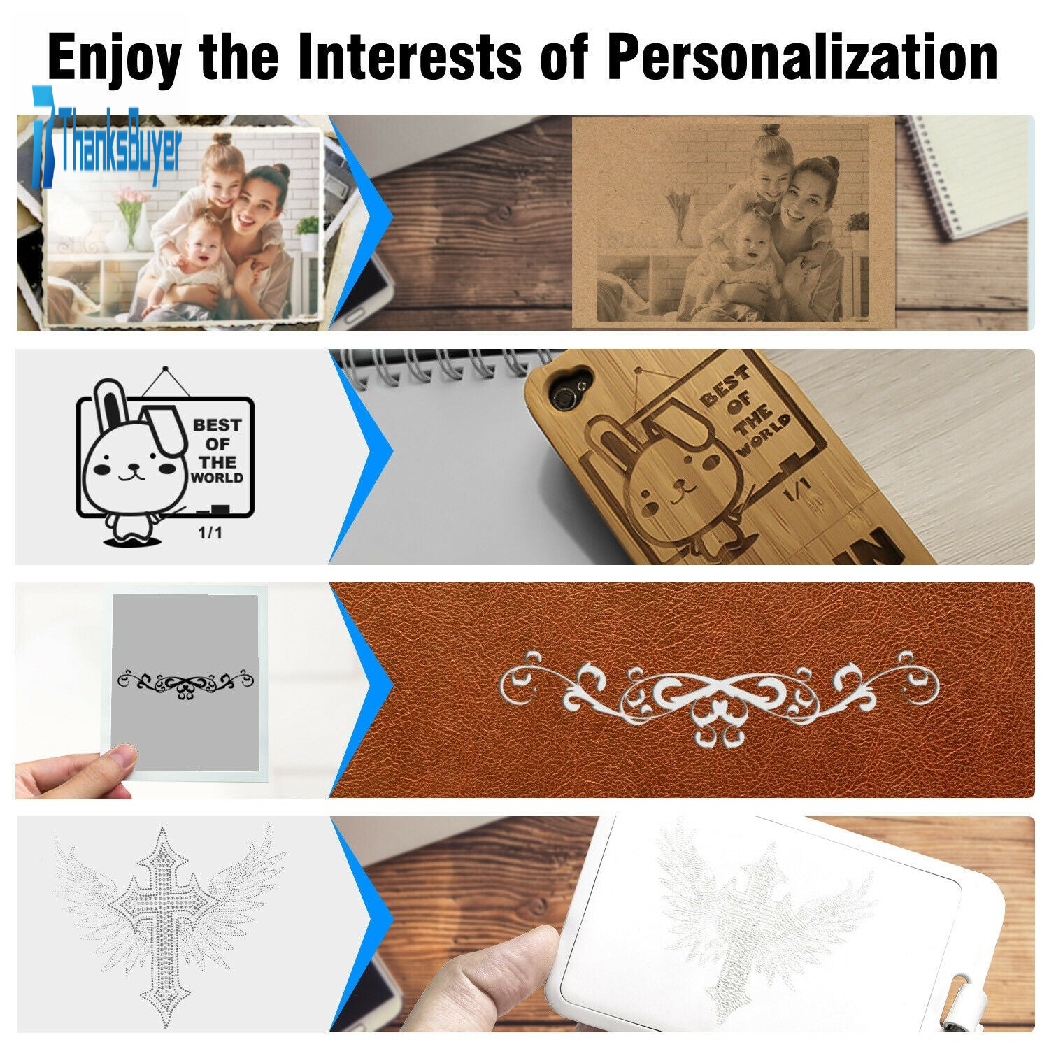 Materials suitable for engraving include: hardwood, plastic, bamboo, rubber, leather, and other flammable plastic (such as cell phone case, mouse, pencil, business card, wallet, plastic comb), painted metal, rosewood, paper card, ivory, PCBA, etc.