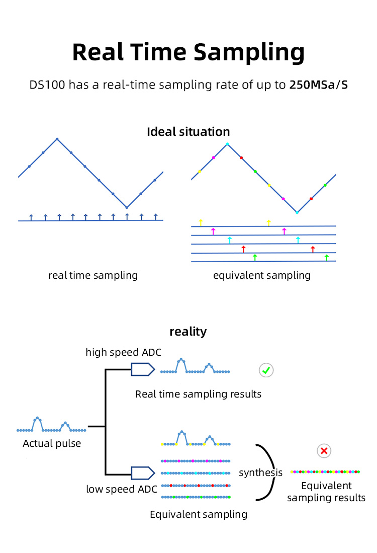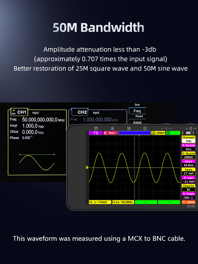 - The oscilloscope has a real-time sampling rate of 250MSa/s, a bandwidth of 50M, and complete trigger functions (single, normal, and automatic).