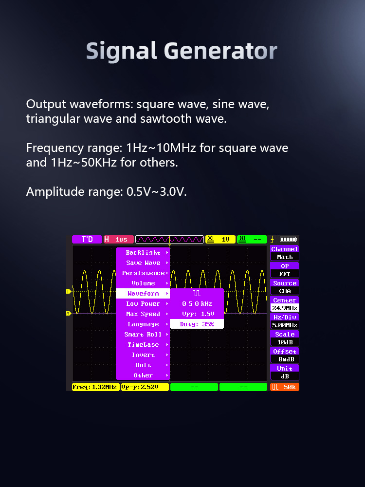 - Output waveform: square wave/sine wave/triangular wave/sawtooth wave