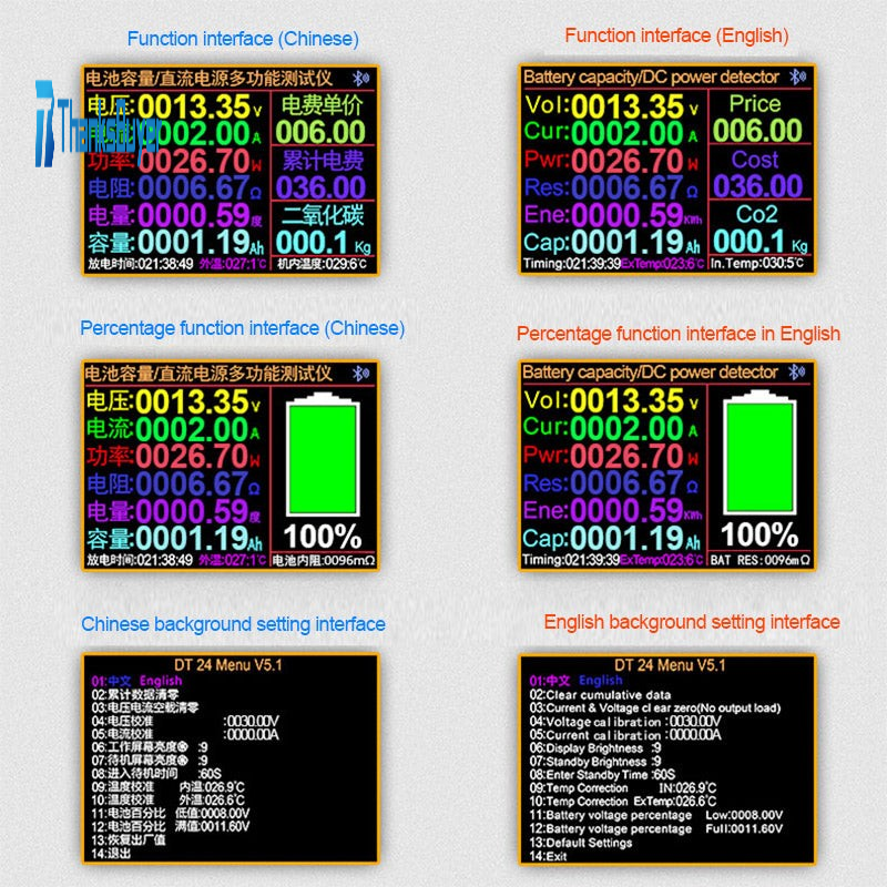 -Battery capacity/DC power supply tester: suitable for various power adapters, batteries, constant current loads, power banks, etc., to test voltage, current, power, capacity, electricity, temperature, resistance, unit price of electricity supply, and cumulative electricity fee , CO2 and other parameters and operations.