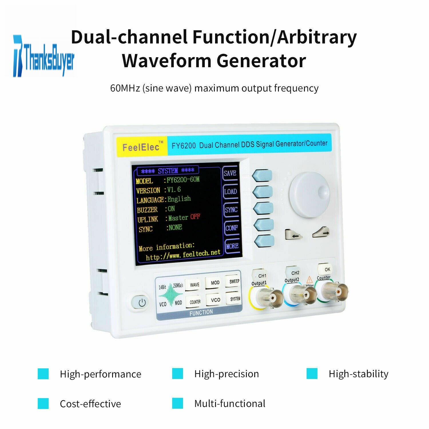 - Dual-channel Function: maximum output frequency 60MHz (sine wave), 250msa/s sampling rate, 14bits vertical resolution.