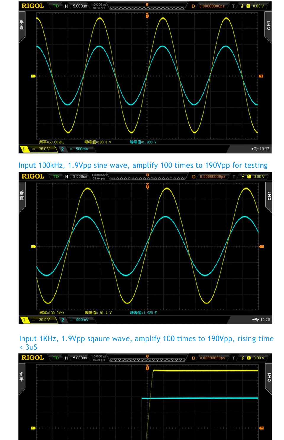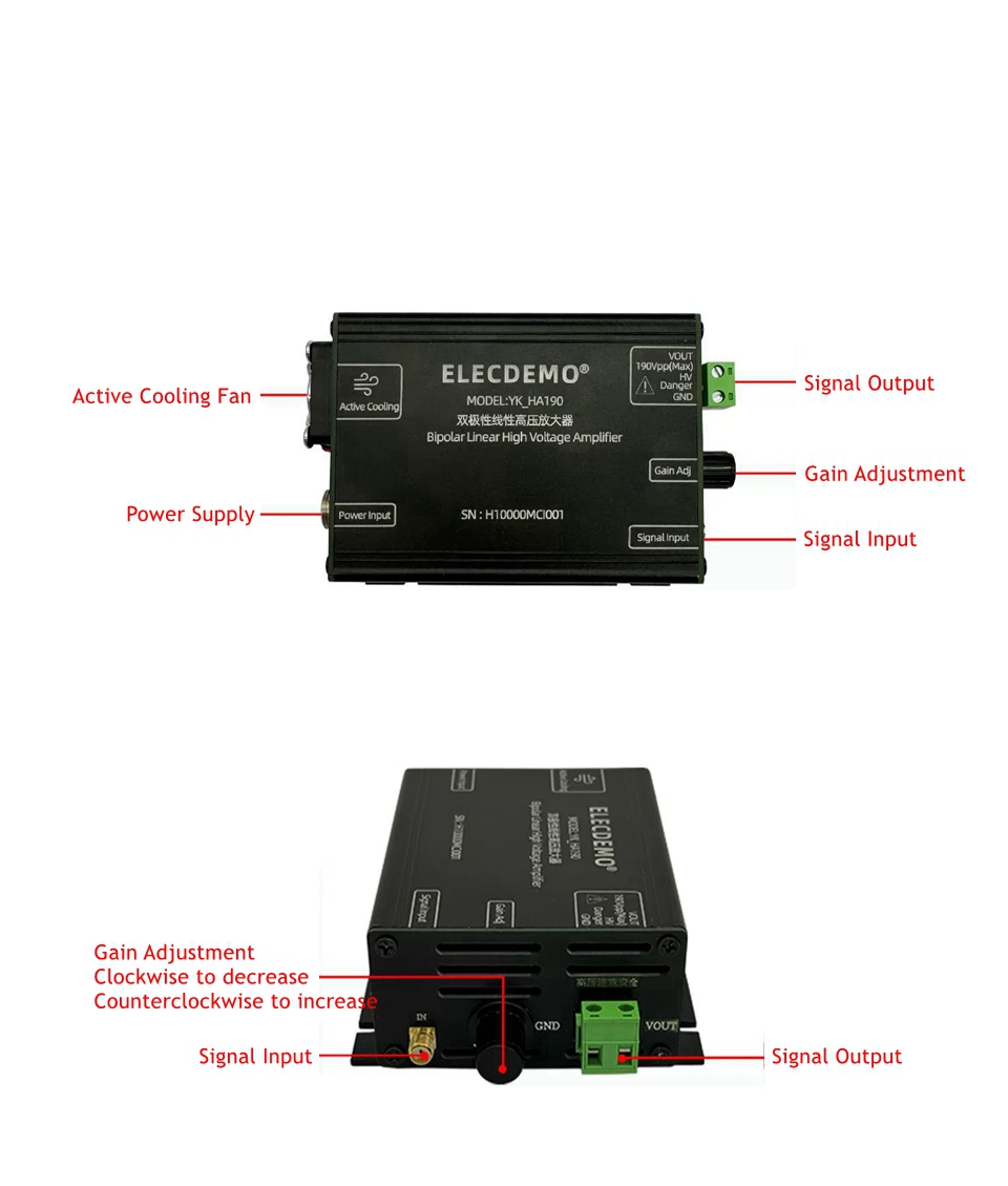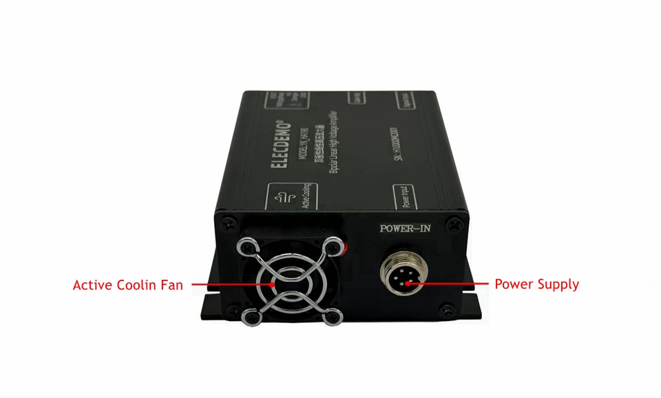- The amplification factor of the product (30- 100 times) can be adjusted by the side knob, and the maximum output can reach 400Vpp. If such a high amplitude is not needed, you can adjust the amplification factor or reduce the input signal amplitude on your own.