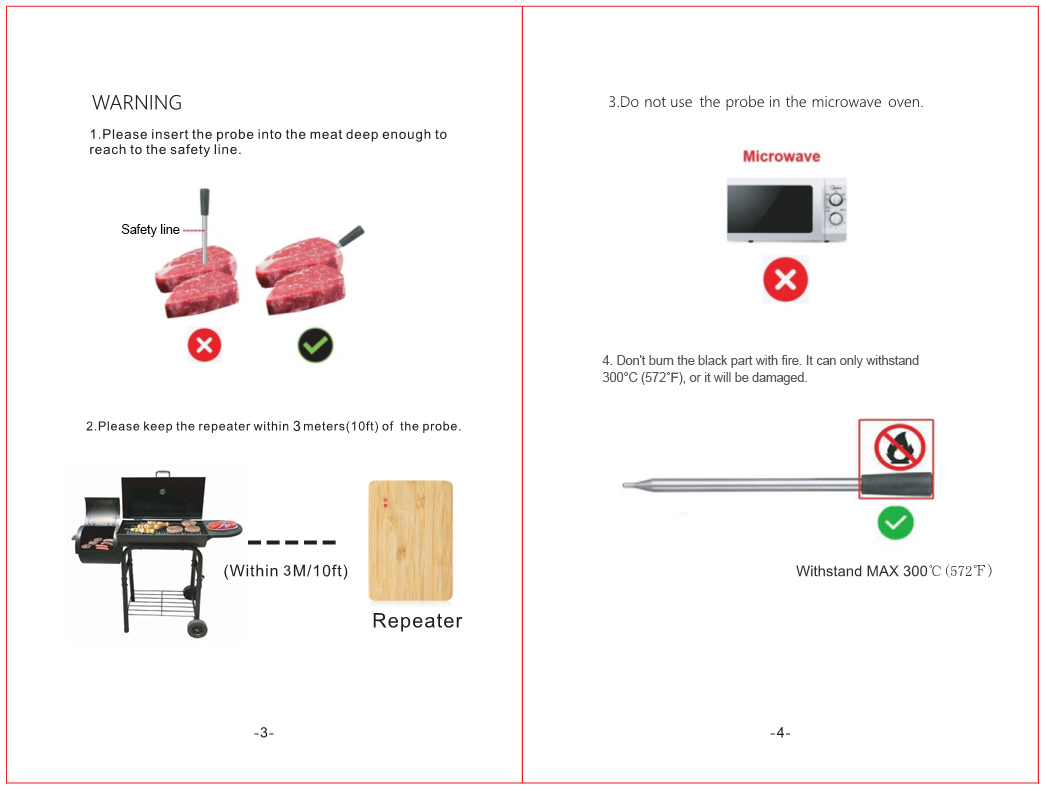 - Do not bake the probe alone because it should be wrapped by food. Its metal pipe should be covered by the food as much as possible.