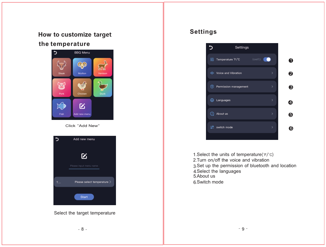 - APP monitoring: The Phone APP can monitor the status of 6 probes working at the same time. When Bluetooth is turned on, the APP will be automatically connected. 7 languages has been added to the APP and users can also manually add ingredients.