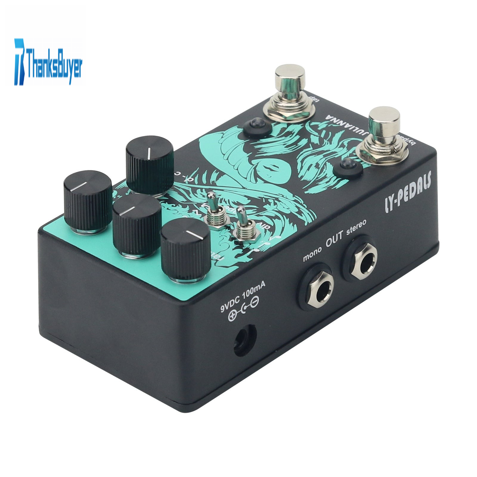 - The jacks on the left side are: power supply 9V100ma internal negative external positive single dedicated power supply; Mono mono output; Stereo stereo output.
