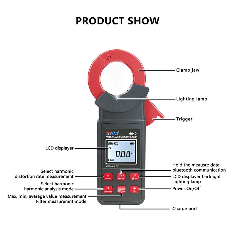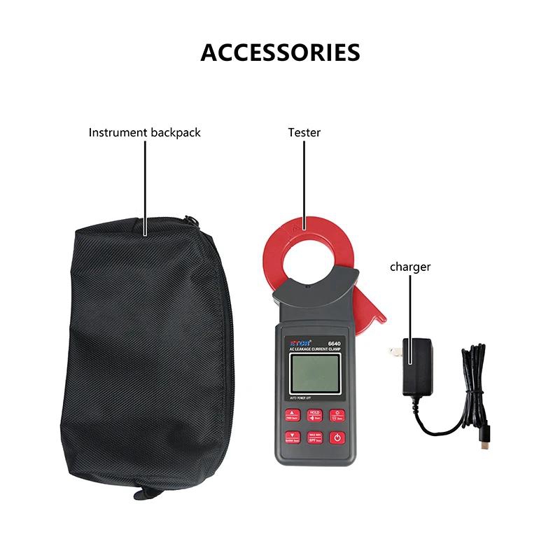 - AC Current Meter: Clamp meter is specially designed for measuring AC leakage current and current, adopts unique CT technology and digital integration technology, with small size, high accuracy and complete functions.