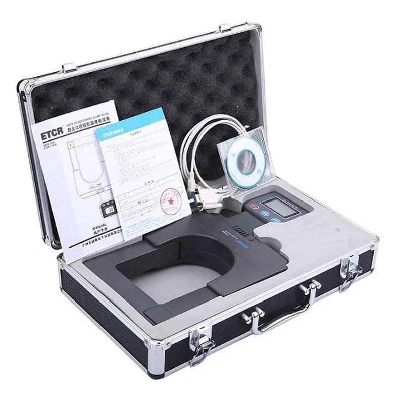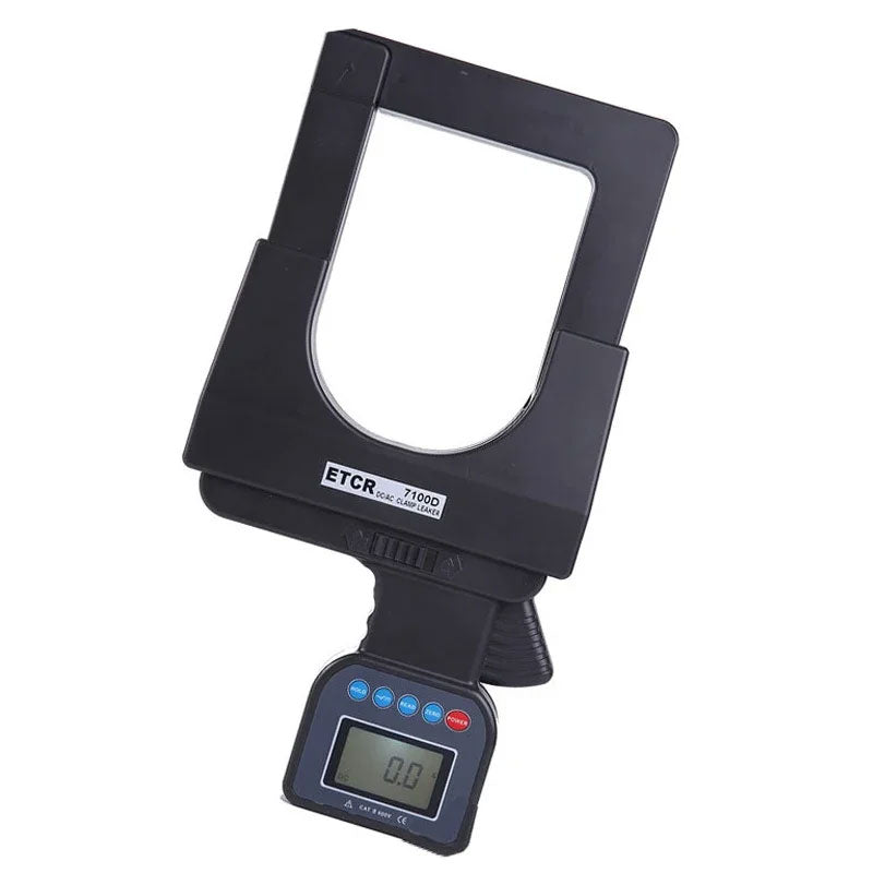 - ETCR7100D Super Large Caliber AC/DC Clamp Meter is well designed and manufactured for measuring AC/DC current below 600V line Measure, it adopt the latest CT technology and digital integrated technology. No exposed metal conductor in the Clamp and no-contact measure model mean current measure operation more safer and quicker. Super large Caliber is  particularly suitable for thick wire current measure. This meter is widely used in electric power, communication, meteorology, railway, oil field, architecture, measuring, teaching research unit, industrial mining enterprises, etc. The instrument with current peak value holding, data holding, data storage and other function. Equipped With USB interface, communication line and supervision software, this meter could achieve current online monitoring, show the real time current condition via computer, with consult historical data, saving, print and other functions.