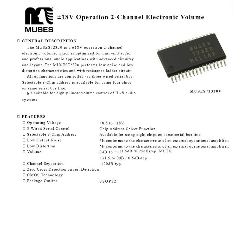 - The MUSES72323 for NJR is currently the best volume control chip in the world. This chip controls the internal adjustable resistor through the SPI interface to adjust the volume. The audio passes through the chip in a fully analog manner, without any digital or VI/IV conversion, and does not affect the sound quality. This chip has advantages such as extremely high DNR and SNR, extremely low THD+N, extremely fine volume adjustment steps, and no built-in operational amplifier (so the sound quality and performance will not be limited by the operational amplifier). The distortion index is much lower than other schemes (such as MAS6116, PGA2310, Alps RK50, Alps RK27, etc.), and should be on par with the R2R resistor/relay network scheme.